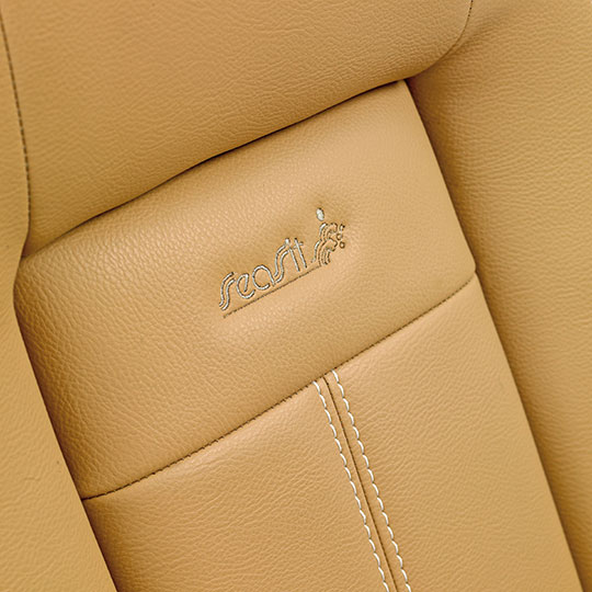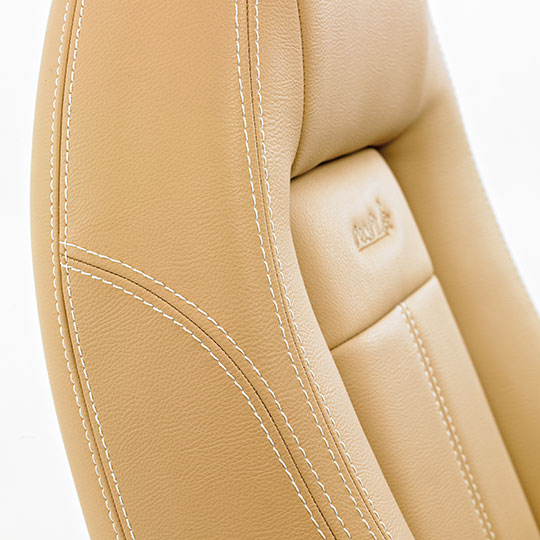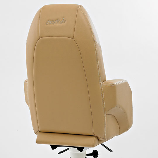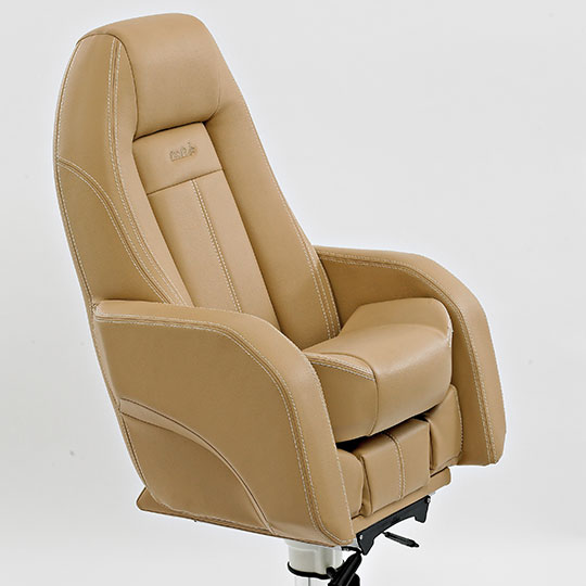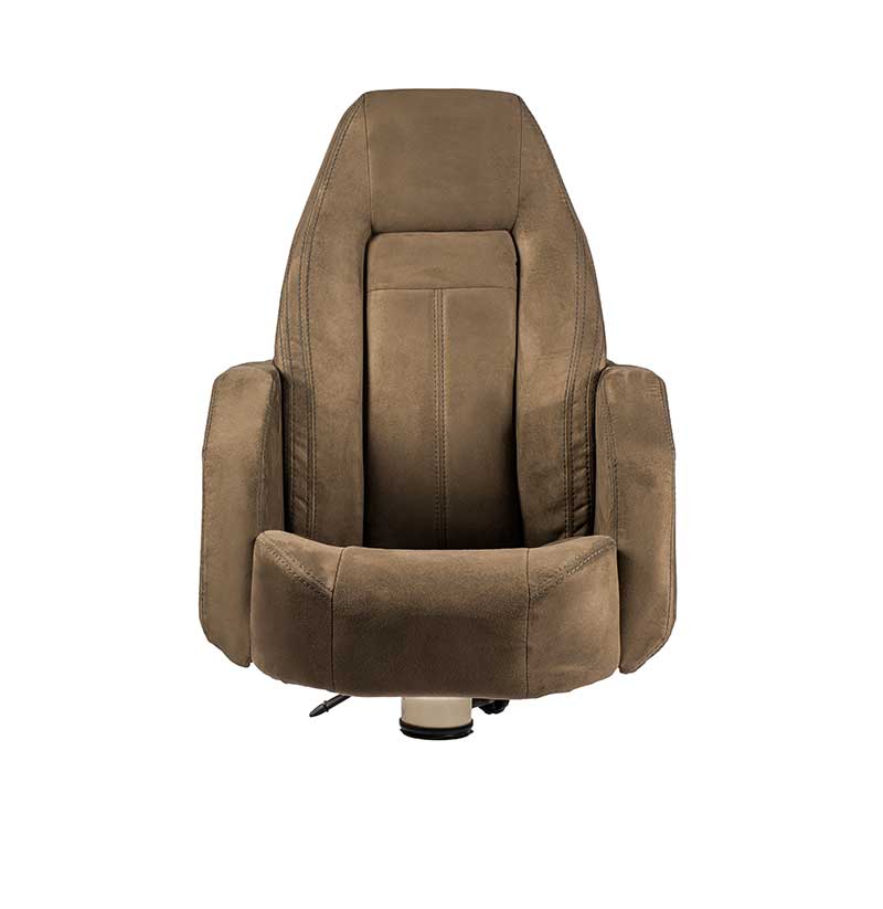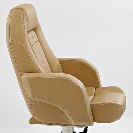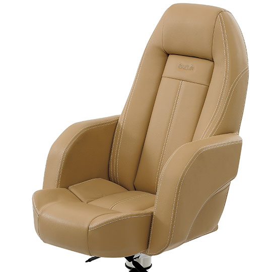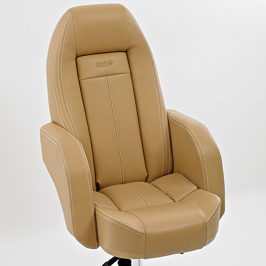 Dette er en stol som har ergonomisk utforming og gir en meget god sittekomfort. Stolen er laget i skum av beste kvalitet og leveres i hud, stoff eller imitert skinn. Leveres med oppvippbar frontpute som standard. Dette er en av våre top-line stolmodeller – den er eksklusiv og populær, og velges av ledende båtprodusenter.