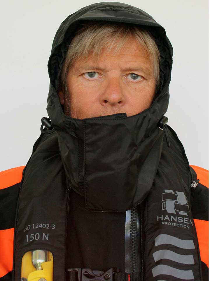- Redningsvesten er utstyrt med hette for beskyttelse mot vind og sjøsprøyt